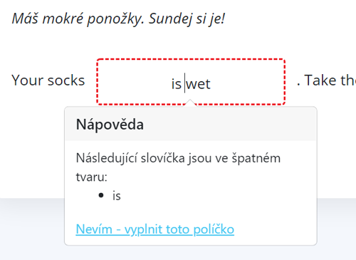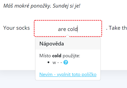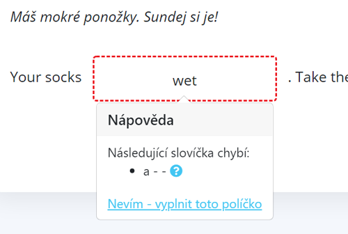Pokud něco zapíšete do políčka špatně či jinak, než je v cílové větě zadáno, aplikace se vás pokusí navést na správné řešení. Na doplnění každého textového políčka máte neomezený počet pokusů. Pokud byste si přesto nevěděli rady, můžete kdykoliv kliknout na “nevím – vyplnit toto políčko”. Počítač políčko vyplní za vás.
