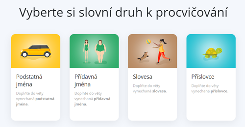 Druhá varianta je určena těm, kteří si chtějí jen slovní zásobu procvičovat. V sekci Samostudium / Slovní zásoba si vyberete ‘Doplňování do vět’ a potom zvolíte slovní druh, který si chcete procvičovat. Na výběr jsou podstatná jména, přídavná jména a příslovce.