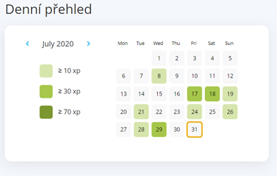 Získané body xp vám přehledně evidujeme. Na hlavní stránce je vidíte graficky zakomponované v měsíčním kalendáři. Světle zelenou barvou se zobrazují dny, kdy jste získali 10 bodů nebo více, sytější zelenou dny, ve kterých jste získali 30 bodů či víc, a nejtmavší zelenou jsou označené dny, kdy jste dosáhli skóre alespoň 70 bodů.