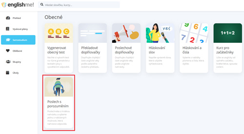 Poslechové testy najdete v sekci Samostudium. Zde jsou původní poslechové doplňovačky (doplňování chybějících částí textu podle poslechu) a jako poslední v nabídce nově najdete Poslech s porozuměním.